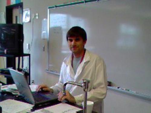 A Frisbee spins tightly on his index finger while he sits at his desk. Sporting a white lab coat and yellow goggles, Eric Prange then pours 50 ml of hydrochloric acid into a graduated cylinder.