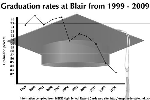 Recent reports by the Maryland State Department of Education (MSDE) show a decrease in graduation rates for Blair and MCPS for the 2008-2009 school year. Statistics by the MSDE show Blair's graduation rate declining from 84.53 percent in 2008 to 82.61 percent in 2009. Likewise, the MCPS graduation rate went from a high of about 93 percent in 2003 to 87 percent in 2009, the lowest graduation rate in 13 years.