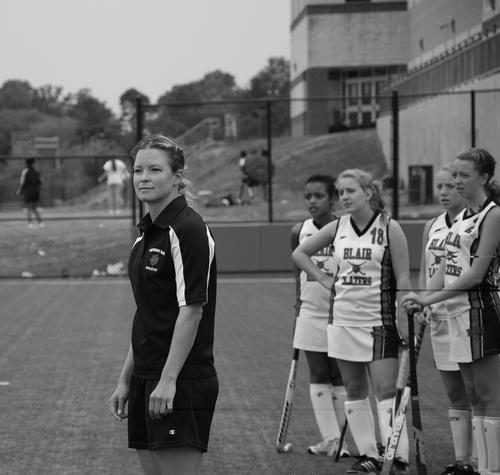 It's game day for varsity field hockey. The ball whizzes across the turf as Blair and Wootton fight for possession, each p layer hungry to get it. New coach Christine Denny stands, surveying the 11 Blair players spread across the field. It may be her first year coaching Blazer field hockey, but it's far from her first year on the field.