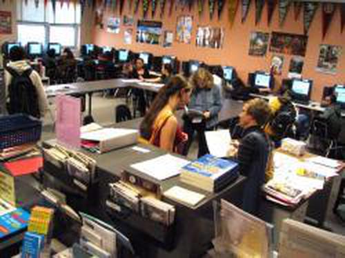 En medio de muchos papeles, copas de chocolate caliente y un plato con galletas medias comidas, varios maestros cansados buscan refugio en la biblioteca de las presuras que resultan delante de las vacaciones. Un ambiente calmado y callado está en el aire. Lo único que se necesita para completar esta foto es un fuego y la vista de una montaña cubierta en nieve por una ventana.